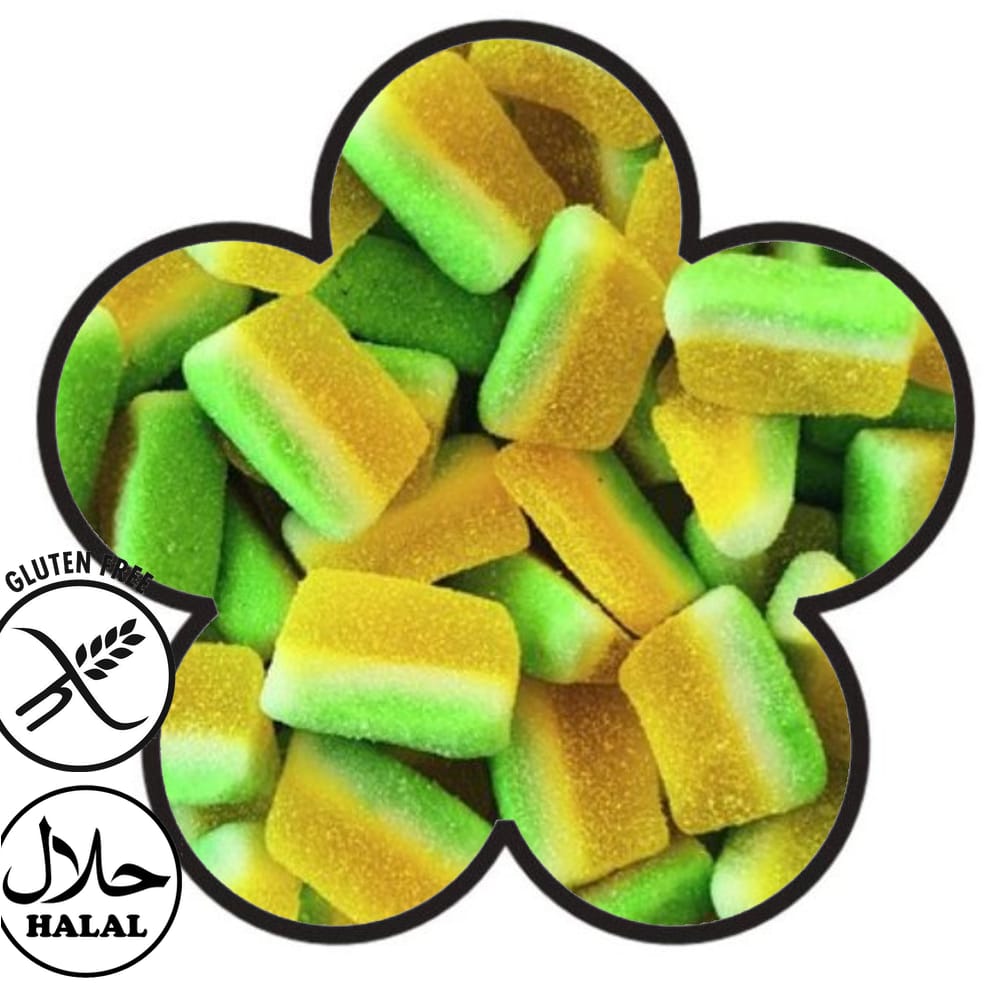 Sirop de glucose-sucre, eau, amidon modifié de pomme de terre-gélatine, acidifiants E330,E296,E270- Arôme, colorant,E102, E133,E516) huile végétale, agent démoulage cire de carnauba